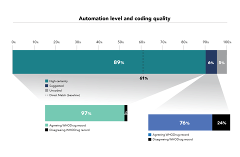 “At the most basic or simplistic level – direct matching the verbatim to WHODrug Global – the absolute difference in automated coding with Koda is 28%,” Rofors says. “We suspect companies are more sophisticated in their automated coding processes than this baseline suggests. They probably have their own coding dictionary based on their own synonym list, but that requires a significant amount of upkeep. Koda can be trained to do that for them.”